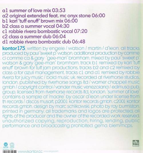 2001 German KONTOR RECORDS pressing, release number KONTOR175, of 2x 12” Maxi Singles by LONYO: Summer Of Love. The track and other details are as shown on the images, as provided. The records have a few extremely faint and barely visible, ineffective sleeve-scratches, is in a seldom played, excellent plus condition. The cover has some faint ring-wear, otherwise in an excellent condition. EX+/EX+ / EX- |