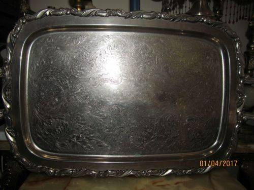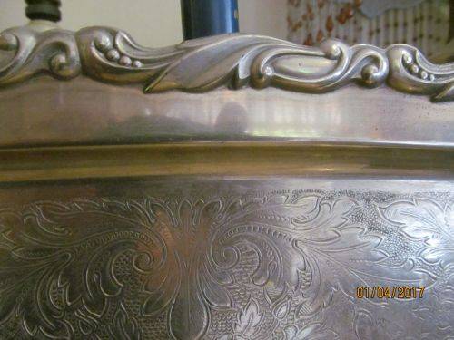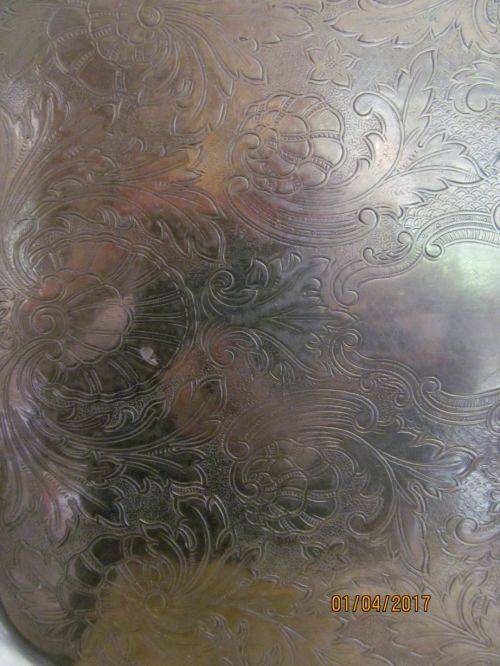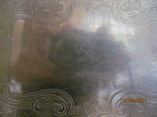 THE TRAYS SURFACE IS ADORNED WITH THE MOST GORGEOUS ENGRAVED PATTERNS ARRAYED IN AN INTRICATE SERIES OF PALM FRONDS, SPECTACULAR LEAVES, MOLLUSCS AND INTERSPERSED FLOWERS ALL SET ON A DIAMOND ETCHED BACKGROUND. THE ARTISTIC TALENT WHICH CREATED THE ENGRAVINGS WAS CAREFULLY OBSERVANT IN LEAVING AN OPEN CARTOUCHE SHAPED PORTION DIRECTLY WITHIN THE CENTER FOR THE PROUD OWNER OF THIS INTRINSIC ITEM TO HAVE THEIR HEARTS' DESIRE ENGRAVED THEREIN. THAT CHOICE....IS YOURS !!
