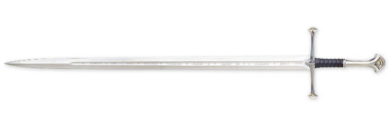 With over 100 million copies sold in over 40 languages, millions have grown up with The Lord of the Rings, the classic epic tale considered by millions to be the greatest fantasy-adventure story ever told. J.R.R. Tolkiens phenomenal epic trilogy chronicles the struggle between good and evil for possession of a magical ring. The book trilogy, named the most popular book of the 20th Century, has been presented in a series of feature films from New Line Cinema. Solid metal cross guard and pommel, antique silver plated finish. 24-K gold plated fittings. Genuine leather-wrapped grip. 420 stainless steel blade. Authentic runes deep-etched on both sides of the false-edged blade. Wood display plaque. Certificate of authenticity. 52 7/8" overall. 40 5/8" blade.