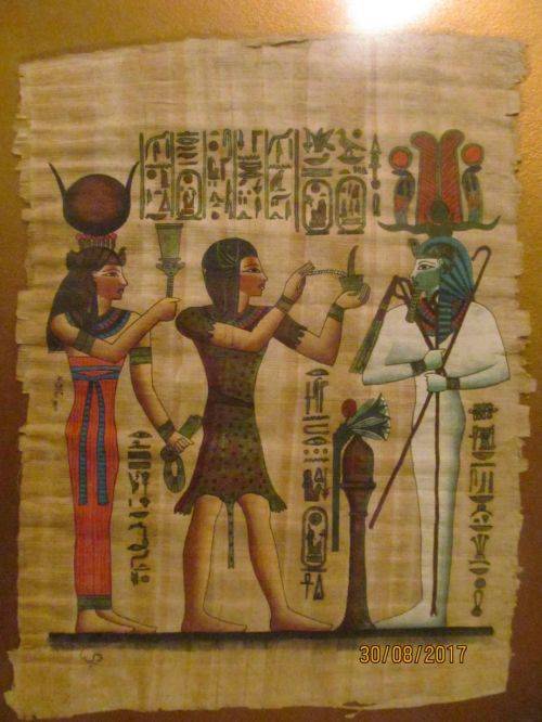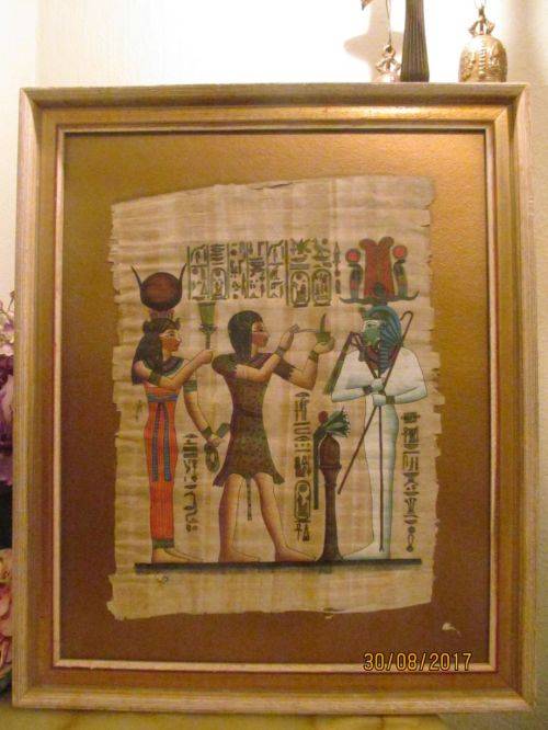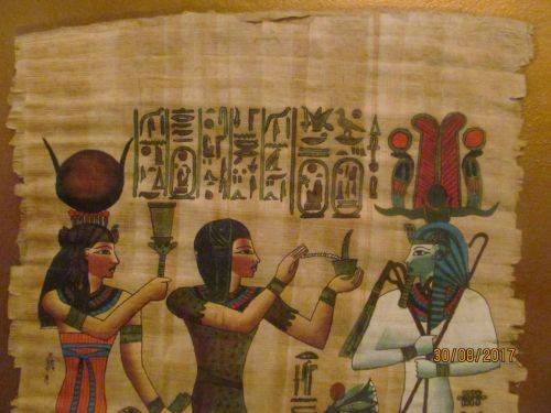 A LOVELY DECORATIVE ITEM OF EGYPTIAN PAINTING ON GENUINE PAPYRUS DEPICTING HISTORICAL IMAGES OF EGYPTIAN SERVANT AND PRIESTESS OFFERING OBLATIONS AND/OR GIFTS TO A DECEASED AND MUMMIFIED PHARAOH. ANCIENT EGYPTIAN HIEROGLYPHIC SCRIPTS HAS BEEN ADDED TO THE PAINTING ABOVE AND BETWEEN THE FIGURES.