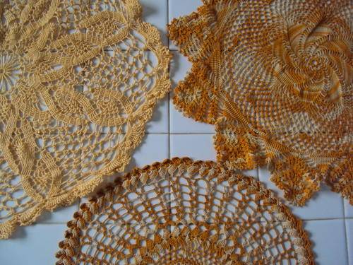 Size:- Lemon colour is 42.5cm, multi pointed doily 39cm and round doily 31.5cm