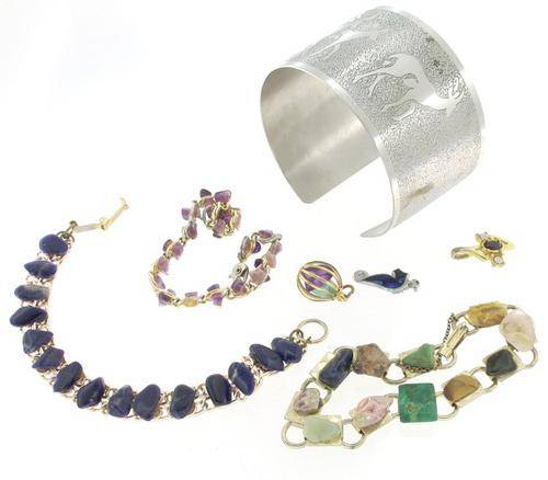 A metal bracelet -- open-ended -- 40mm wide. Three polished stone bracelets -- the small amethyst one is missing stones.