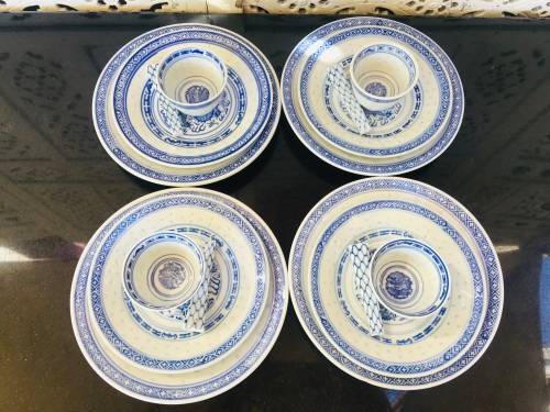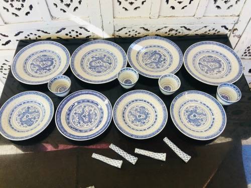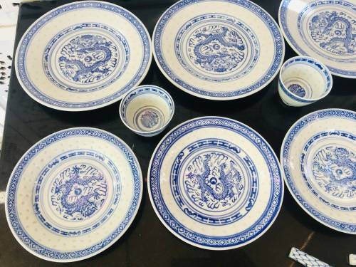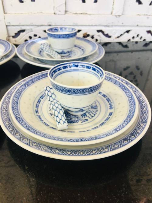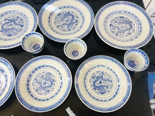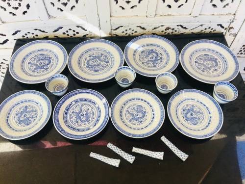 Lot of 12 pc Vintage Marked Chinese Rice Grain Pattern Blue Dragon Hand Painted Tableware.
