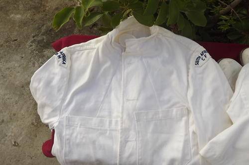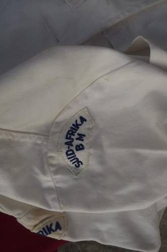 Lot of 2 South African CF Jackets - spots on. Another plain white jacket in good condition. One pair 81/2 white navy shoes - printed inside Eddels 1968