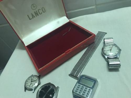On offer today we have a Lot of 4 Watches 2 Lanco Sport one from the 50s and one from the 60s both Running Could use a Sirvice but works there is a Sieko Sealion m55 Still Running and ticks if u shake but just needs a Glass and a Strap and hands the Face is still mint , the other just could use a battery not sure though all in the original hard Red plastic Lanco box