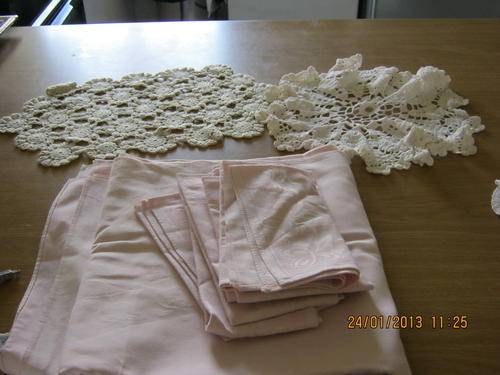 2x round crochet cloths, 2 tray cloths, 2 long armrest cloths plus a pink square linen tableclots with 6 serviettes.
