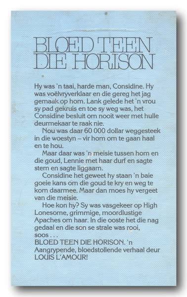 Louis L'Amour - Bloed teen die Horison (2001). A5, hardeband, 112 bls. Buiteblad effens verweer. Boek binne in goeie leesbare toestand.