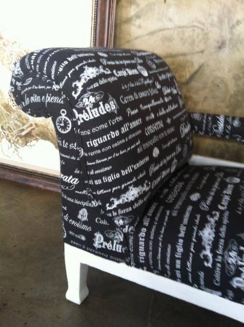 Upholstered in Chocolate Brown fabric with 'French Script' - paint work shabby chic in white