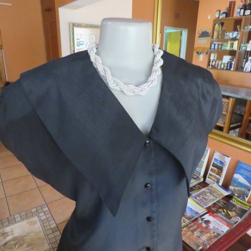 Lovely black silky polyester button down top with tiny cut-on sleeves and beautiful wide pointed collar. With shoulder pads. Size 40/16. Label cut off. New condition.