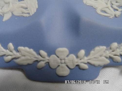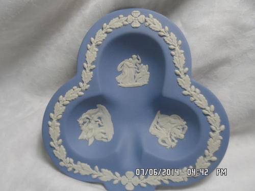 A LOVELY WEDGEWOOD BLUE ASHTRAY. IT IS AN UNUSUAL SHAPE AND IS VERY ORNATELY PATTERNED WITH 3 DIFFERENT SCENES ON THE INNER SECTION AND EDGED WITH A DELICATE FLOWER AND LEAF PATTERN. IT IS IN PERFECT CONDITION WITH NO CHIPS OR CRACK.IT MEASURES 11,3 CMS IN DIAMETER.