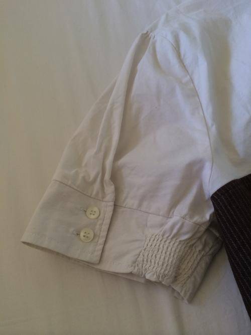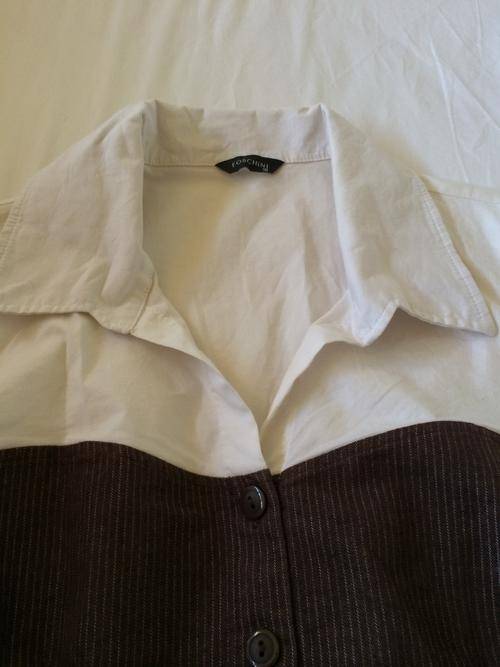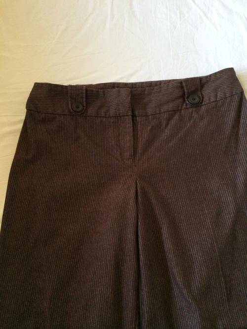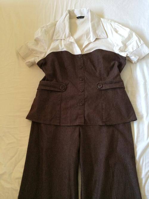 This lovely chocolate brown ladies suit has a fine white pin strip on the top and pants. The top part of the suit looks like a white blouse under which starts above the breasts and has short sleeves. There is lovely detailing on the suit. It is made of a very high quality fabric and will fit a size 16 with comfort although the label size is 18 (it is a smallish cut). It is in excellent condition - hardly used.