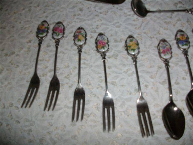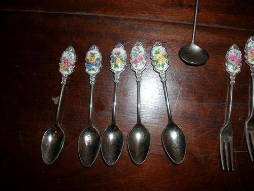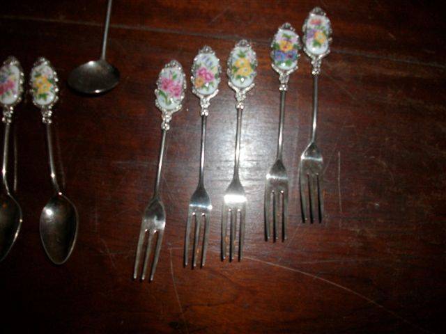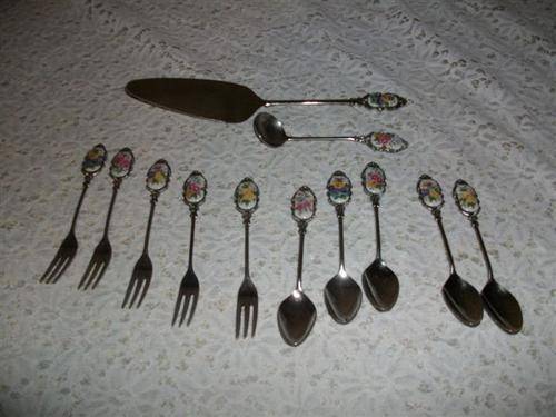 Lovely sliver plated cake set complete with five cake forks and five tea spoons , cake lifter and sugar spoon . please view the pictures as part as the decripition. item in good used condition.