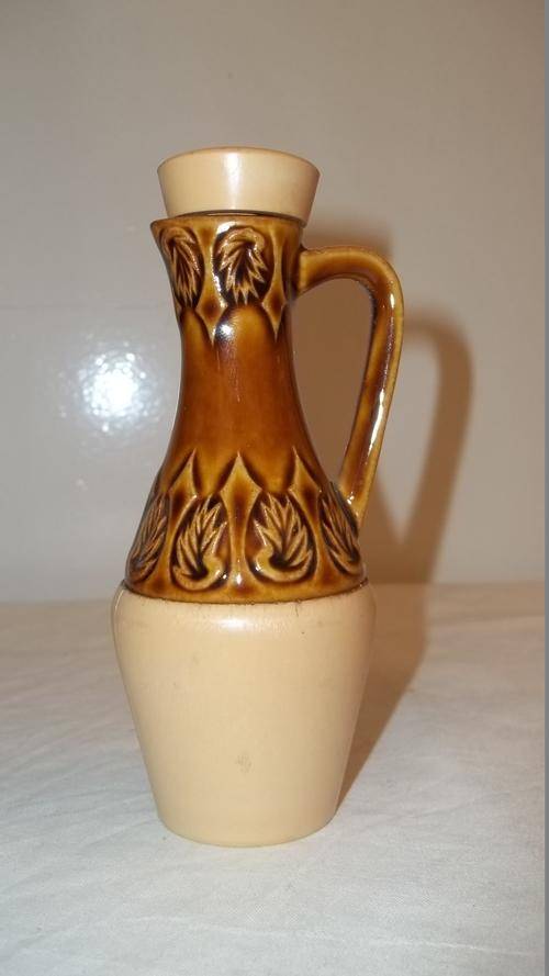 THIS LOVELY LITTLE VINEGAR BOTTLE MEASURES 14 cm TALL AND HAS A VERY PRETTY BROWN GLAZE ON IT. THE LID HAS A CORK STOPPER. THE BOTTLE WOULD ALSO BE GREAT FOR WORCESTERSHIRE SAUCE, OLIVE OIL OR EVEN BALSAMIC VINEGAR