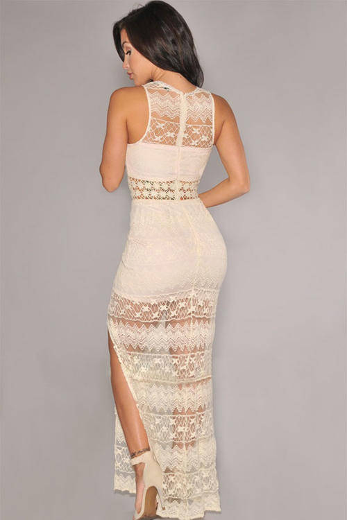 LOVELY CREAM CROCHET LACE ACCENT EVENING DRESS