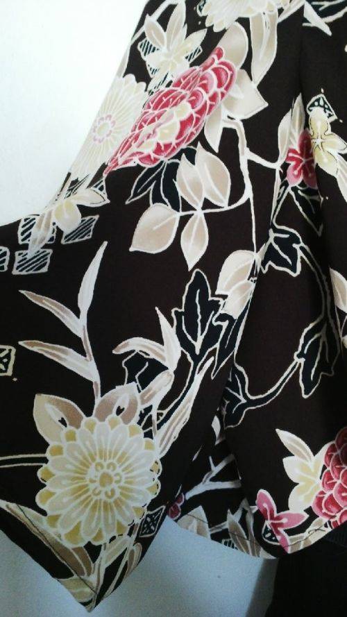 Lovely brown, cropped, overshirt / jacket , silky fabric with vibrant tropical flowers and tie up in front will turn any plain outfit into a special occasion outfit, in Very good condition