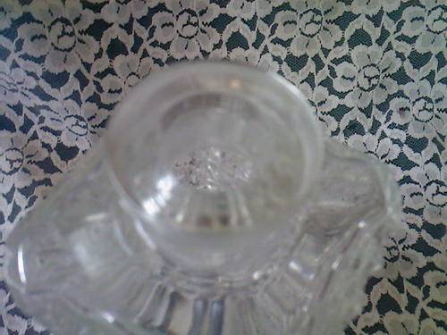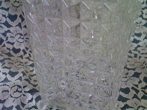 Here we have a square-shaped cutglass decanter which was made in France. There is absolutely no damage to this item, which judging from the discolouring of the plastic on the stopper must be quite old. There is writing imprinted on the base, but I cannot quite make it all out. Measures 22.5cm in height.