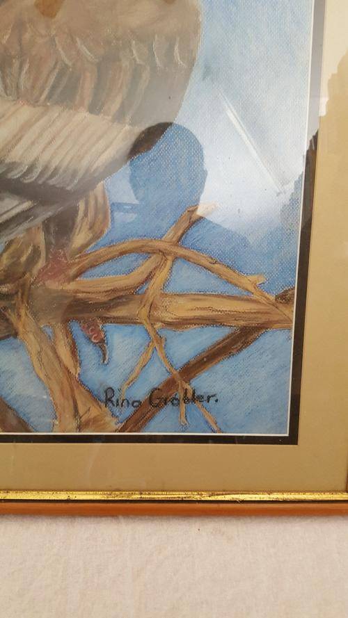Stunningly bright Pastel by Rina Grobler of a Majestic Eagle sitting on a branch. Frame - 62cm x 82cm. Pastel - 48cm x 68cm. Framed with glass