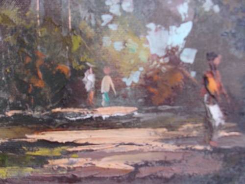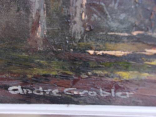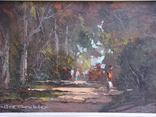 Lovely framed oil on board painting signed Andre Grobler - Forest Path. This lovely painting by world renowned South African artist Andre Grobler (1938-2011) dates to the 1980s. It is a painting of people walking through the forest on a foot path. The painting is signed Andre Grobler in the bottom left hand corner. It is housed in a lovely gilded wood frame, and measures 40cm x 26cm, and the frame 50cm x 39cm. It is in good condition. Great investment buy for your home.
