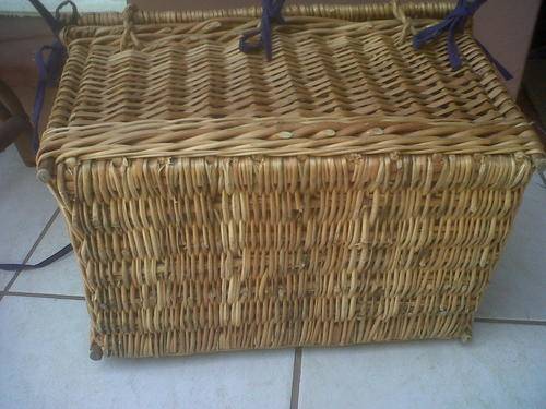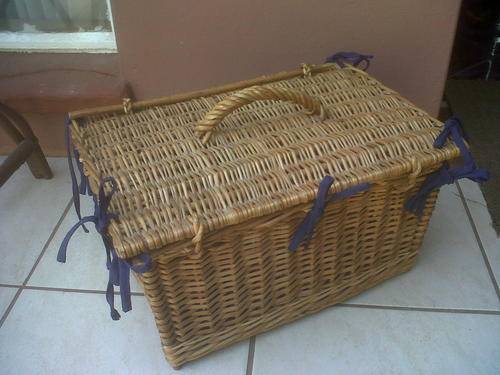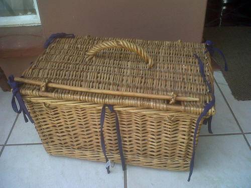 LOVELY LARGE BLUE LINED PICNIC BASKET, GREAT FOR THOSE SUNNY DAYS OUT.