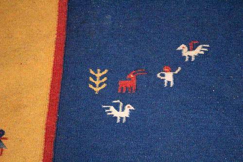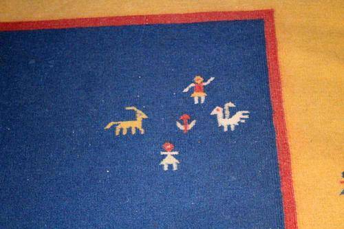 This rug is a flat weave - similar to a kelim, but a bit thicker and firmer. It shows the beginning of wear in spots, but it is still in good condition. The coulours make it perfectly suited for a child's room, but its use is not limited to this area.