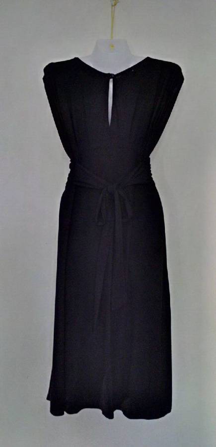 Lovely Little Black dress with pleats at front above and below nice wide waistband and on shoulders, tie belt and button fastening on back of neck, by Wallis (tiny hole on back see pic ) otherwise in Very good condition