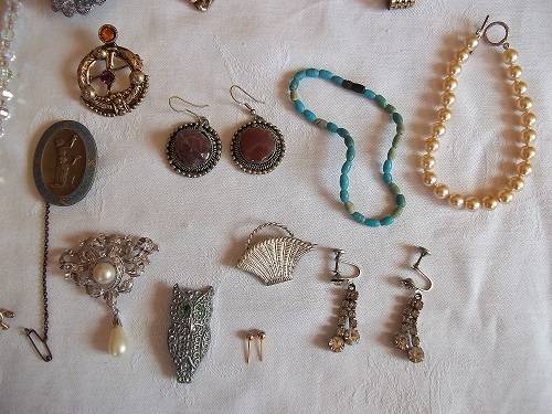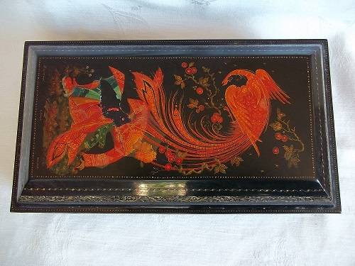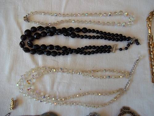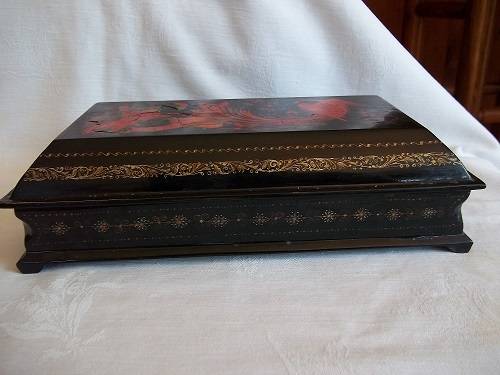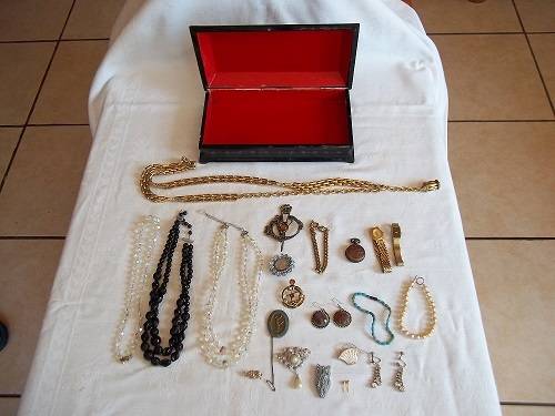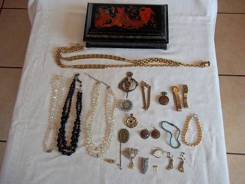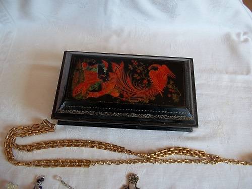 Lovely old lacquered jewellery box of vintage costume jewellery. This lovely old box is black with Japanese scenes and golden edging. The box is on feet, and measures 25cm x 14cm. It is filled with costume jewellery including an antique pair of ladies earings, 1960s glass neclaces, a number of brooches including a couple of Scottish design, some earings, 2 Seiko ladies watches and a little quartz collar watch. Everything is in good condition except that there is some peeling on the top of the box. Great buy for 1 bid.