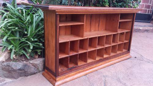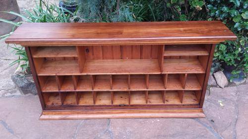 Low, wooden letter cabinet. This was used in a business for sorting post. Can still be used for that, or a display cabinet. Just been restored and in a beautiful condition. Could also maybe work as a counter for a shop / business. 1,47 cm long, 71.5 cm high and 28 cm deep |
