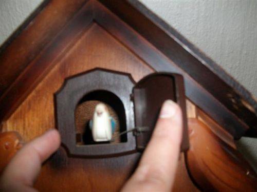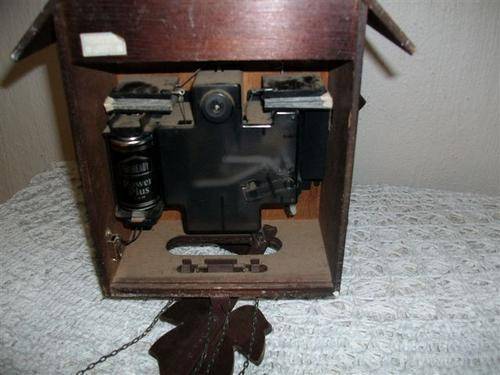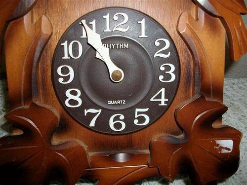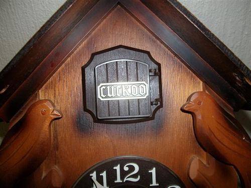 Nice battery operated wall Rhythm cuckoo clock the clock is in good working order it has two plastic type weights one of them is damaged on the top other in good condition the clock has a small amount of damage on the top of the clock small peace of wood chipped off other still lovely +-35cm by+-25cmpostage will be R70 please
