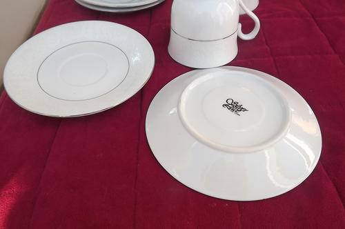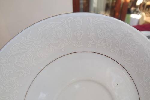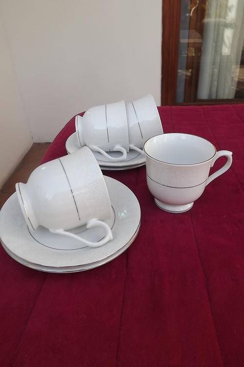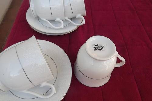Lovely Set of 4 Silver Lace Fine China Cups and Saucers with Embossed Lace Pattern & Silver Rims