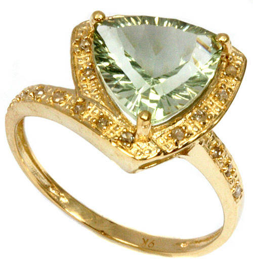 LOVELY SOLID 9KT YELLOW GOLD GENUINE GREEN AMETHYST & DIAMOND RING