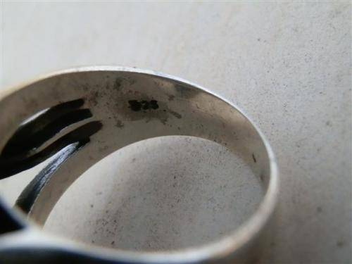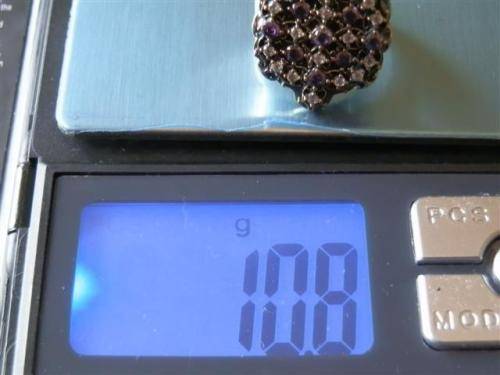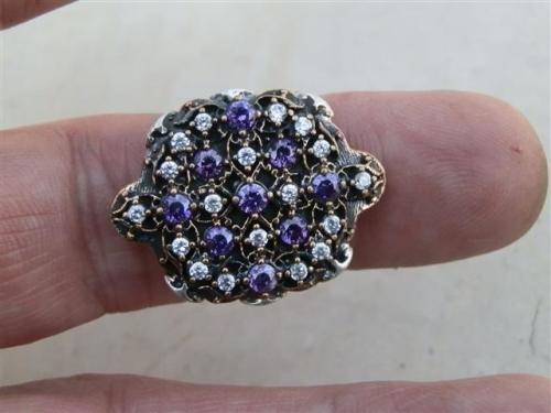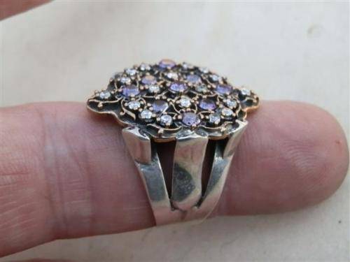 Beautiful sterling silver ring with purple and clear stones and bronze accent, marked 925 and in good condition. The size is Q / 8.5, top width 27 mm and the weight 10.8 g. Very nice!!