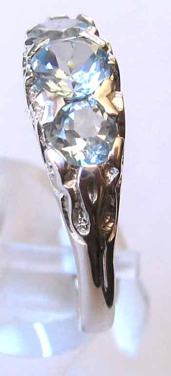 This sterling silver ring is set with 3 pieces of round cut sky blue topaz. one 5.00 mm round faceted cut topaz on the middle and 2 pieces of 3.50 mm round cut topaz , is set in sterling silver & stamped 925. The ring is size " N + " or number 7 , lovely new ring for a best price.Thanks for viewing.
