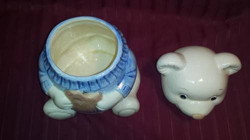 Lovely teddy bear cookie jar. Nice and big, sweet looking teddy and in a lovely condition. Awesome place to put your kids favourite treats. No chips, clean and very useable.