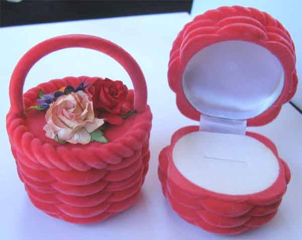 Lovely - velvet pink colour '' basket with flowers '' -box for ring, light pink ,red and perple flowers, measures 85.00 mm high including the handle x 62.00 mm round and 48.00 mm deep without handle, same as the image ,