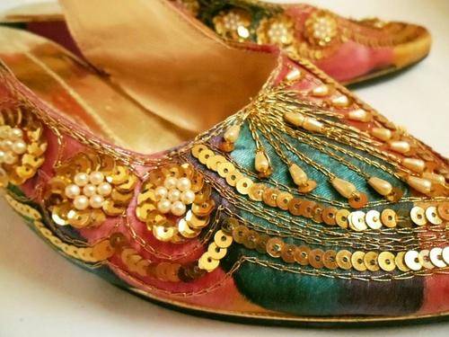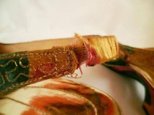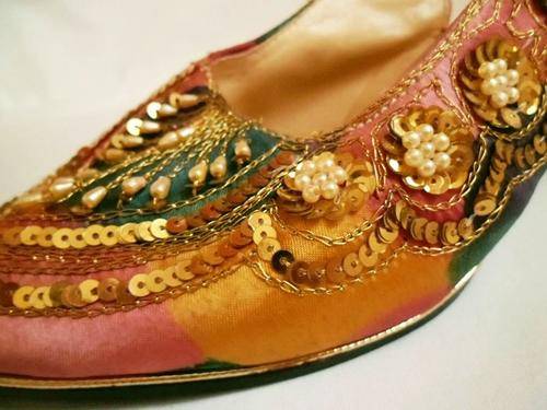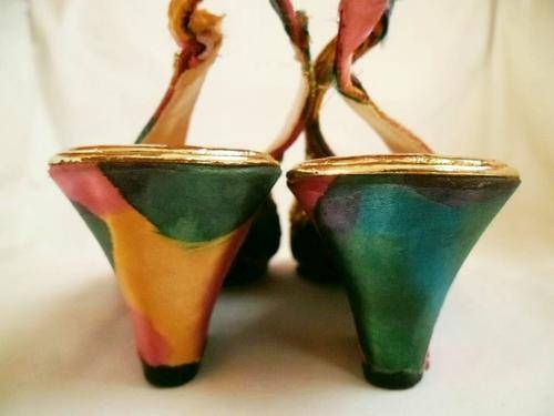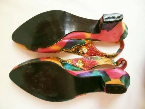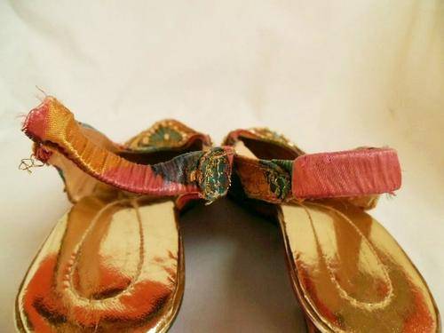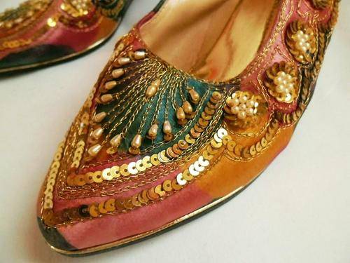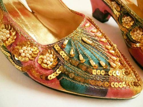 LOVELY VINTAGE COLOURFUL BATIK INDIAN LOOK SLING BACK SHOES WITH PEARLS & GOLDEN SEQUINS, SIZE 4.5