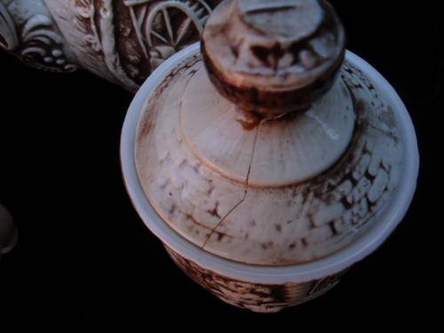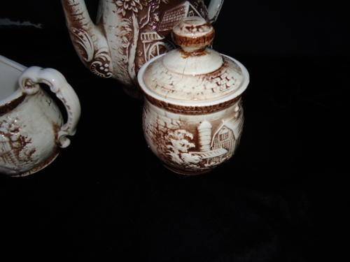 LOVELY VINTAGE 5 PIECE MADE IN JAPAN TEA/COFFEE SET.EMBOSSED PICTURES OF WATERMILL,TREE AND HOME.PLEASE NOTE LID OF SUGAR BOWL HAS BEEN GLUED.POSTAGE,PACKAGING AND INSURANCE R85.00.PAYMENT EXPECTED WITHIN 48 HOURS OF AUCTION END.