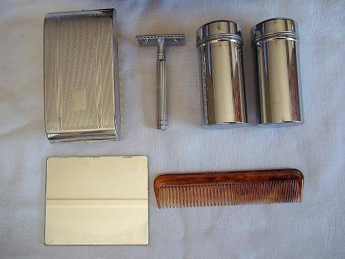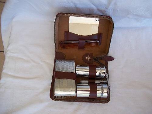 Lovely vintage mens grooming set in solid hide bag - mint condition. This lovely set has a chrome topped brush, 2 tubular chrome containers, a Souplex safety razor - made in England, a comb and a mirror. It has a tan leather bag marked Made in England. The set looks unused. A beautiful gift for the man in your life.