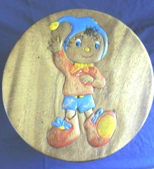 25CM TALL WITH A SEAT DIAMETER OF 29CM WITH A BEAUTIFULLY CARVED AND PAINTED NODDY ON THE SEAT.PAINTING HAS FADED OVER TIME AND IDEALLY NEEDS A NEW COAT BUT OTHER THAN THAT STOOL IN VERY GOOD CONDITION AND VERY STURDY. LOVELY ADDITION TO KIDDIE'S ROOM!! RATHER LARGE ITEM SO POSTAGE WILL BE R75. REFER IMAGES
