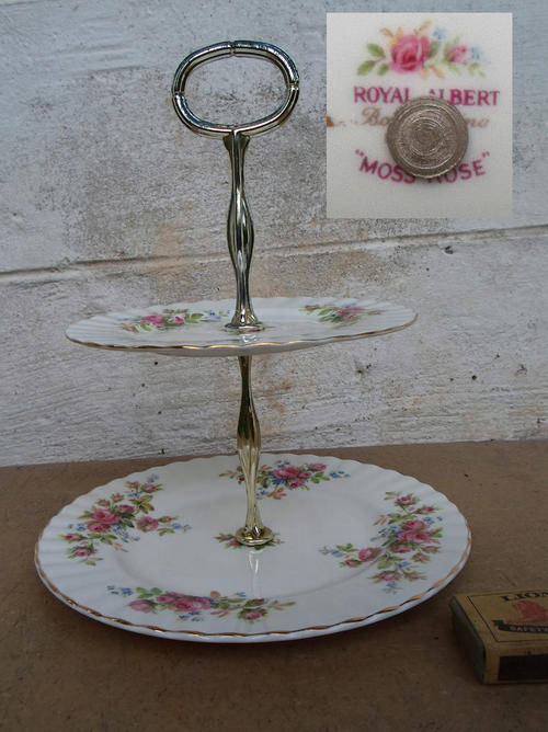 Lovely Royal Albert, Moss Rose pattern, seldom seen two Tier porcelain cup cake stand with silver plate supports and handle, all intact, not broken, screws intact, working. No crazing, cracks or chips to porcelain. Gilt edges clean, not worn. Handle grip shows some wear.
