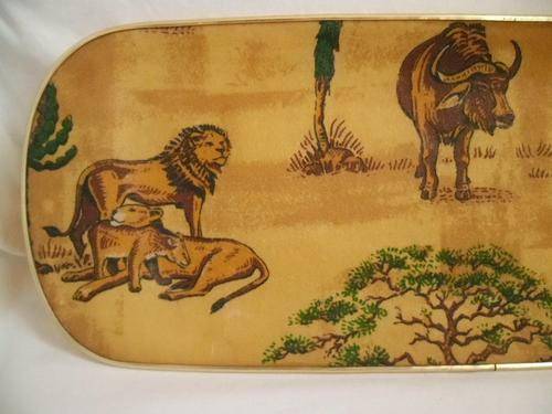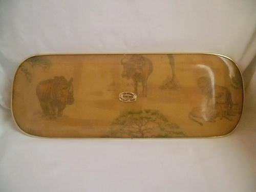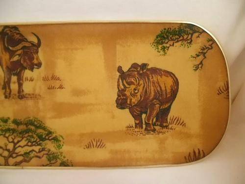 LOVELY VINTAGE WILDLIFE GLASS FIRBRE TRAY BY *TORO DESIGNS ESTCOURT NATAL*; RHINO, BUFFALO & LIONS