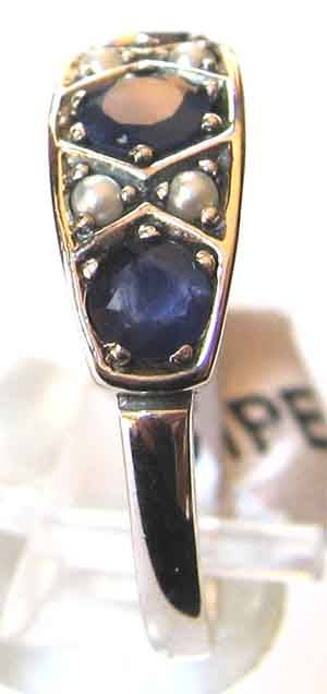 This sterling silver ring- stamped 925, is set with 3 pieces approx . one 3.70 mm round cut blue sapphire , 2 pieces of 3.00 mm round cut blue sapphires and 4 pieces of 1.00 mm white- round seed pearls - all natural stones. It is in very good condition, New, antique style . The ring is size - British " N " or Number 7 or 14 or 54 . Lovely ring !