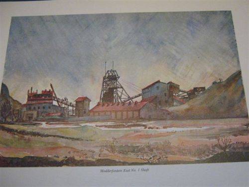 THIS IS A COMPLETE AND WELL PRESERVED PORTFOLIO OF 14 WATERCOLOUR PAINTINGS WITH HISTORICAL COMMENTS ON THE WITWATERSRAND AND SOME OF ITS MINES BY K. S. BIRCH. THE COVER HAS A PERSONAL, HAND WRITTEN MESSAGE TO A GORDON THYS LANGE WHO WASA LIEUT. SERVING IN THE NO 5 BATTALION, QUEENS OWN, ROYAL WEST KENT REGT, C.M.F.IN 1944 ITALY. SIGNED BY K.S. BIRCH HIMSELF DATED FOR 20/10/81 AND IS NUMBERED NO. 85 IN THE SERIES, WHICH I BELEIVE WAS THE VERY FIRST TO BE PUBLISHED, EACH PICTURE MEASURES 43 CM X31 CM AND THEY ARE IN PERFECT CONDITION. THERE IS A TRIBUTE TO THE ARTIST BY MR. R. S. LAWRENCE, PRESIDENT OF THE CHAMBER OF MINES OF SOUTH AFRICA AND A BIOGRAPHICAL NOTE ON K.S. BIRCH.``