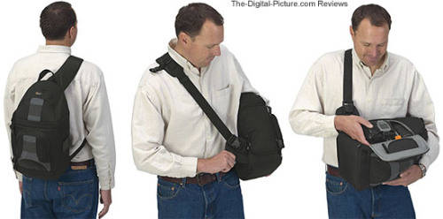 The Lowepro Slingshot 200 AW is shown above with the near-largest camera and lens combination that fit in the designed location. This a Canon 1-Series pro body (the Canon EOS 1D Mark III Digital SLR) with a Canon EF 24-70mm f/2.8 L USM Lens attached with lens hood reversed.