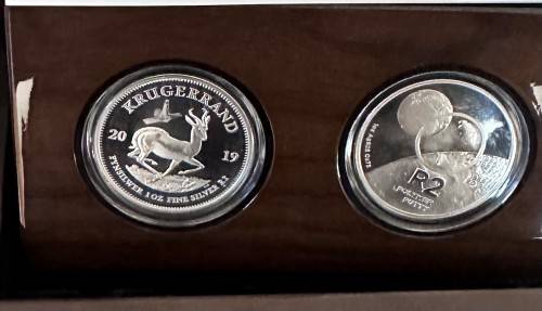 Consists of 1oz silver Krugerrand Lunar Lander Privy coin AND 1oz Polymer Putty R2 coin SA invention series in original box with SA Mint certificate.
