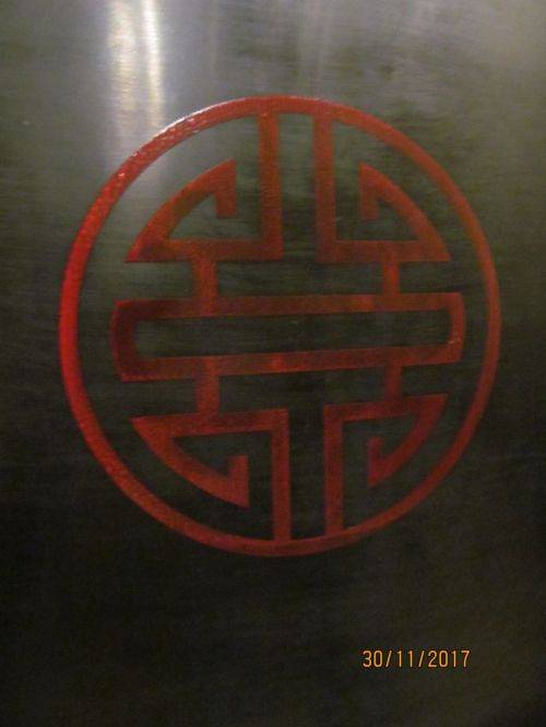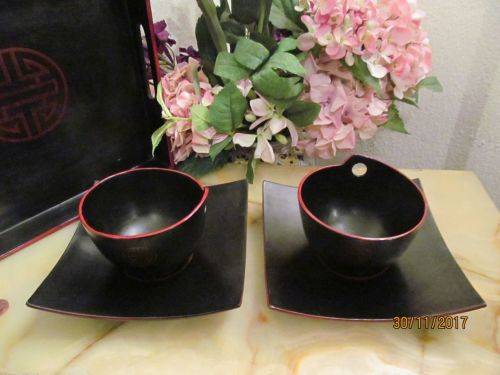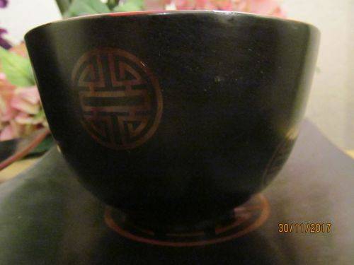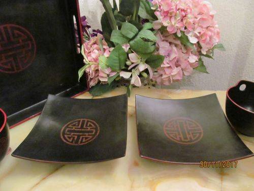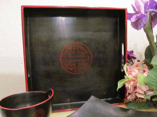 THIS IS A RARE CHINESE SET WITH EACH ITEM BEAUTIFULLY CRAFTED FROM WOOD AND DECORATED IN BLACK AND RED WITH A CHINESE "LU" SYMBOL ADORNING THE ITEMS. THE "LU" SYMBOL IS A STYLISATION OF THE "LU" CHARACTER, MEANING PROSPERITY, STABILITY AND FIRMNESS. THE CHARACTER REPRESENTS THE CONSTELLATION URSA MAJOR, THE AXIS MUNDI, LIKEWISE TO THE INDO-EUROPEAN SWASTIKA SYMBOL.