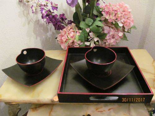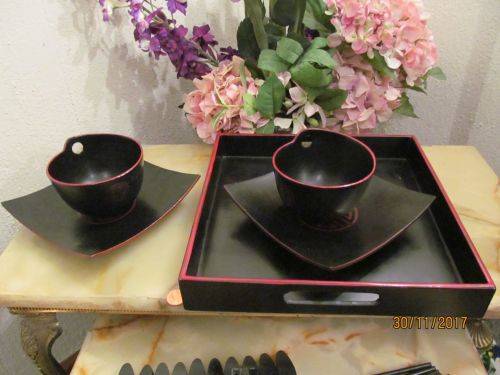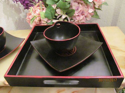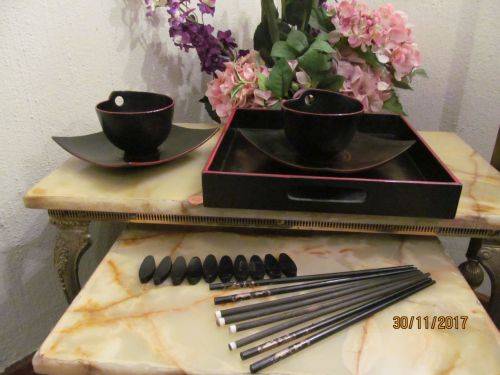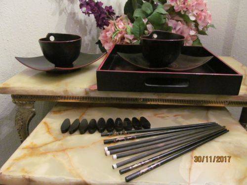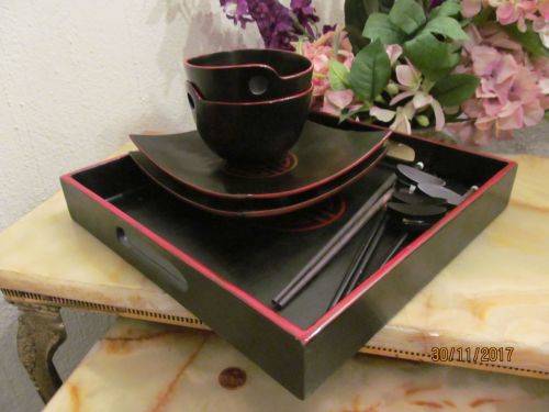 VINTAGE CHINESE SET CONSISTING OF TRAY, CHOPSTICKS, REST, TWO BOWLS EACH WITH SQUARE UNDER PLATES ALL CRAFTED FROM WOOD