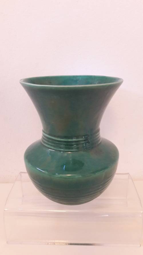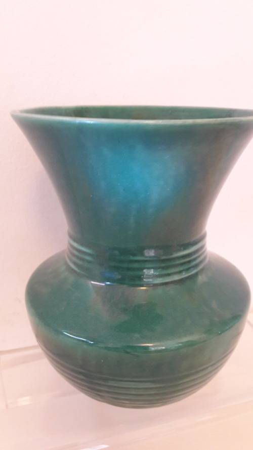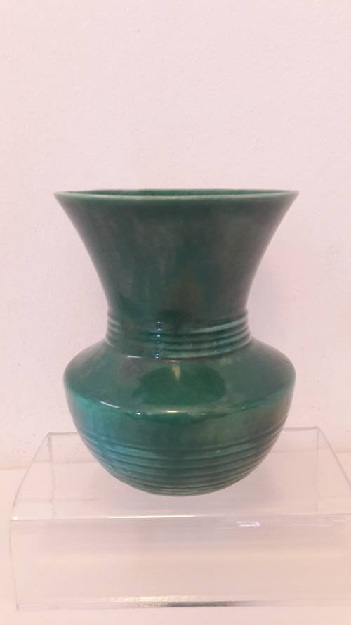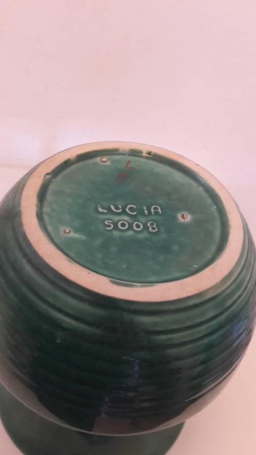 Offered for sale is an attractive medium sized Lucia studio pottery vase made in the 1950's in Boksburg on the East Rand of Johannesburg. Lucia was a subsidiary of BEP Boksburg East Pottery, the most prolific and popular Mid century Modern ceramic manufacturer in South Africa. This vase has a stylish understated elegance and the design seems strongly influenced by Art Deco prototypes . The vase has a broad flared neck and wide top aperture narrowing to meet a bulbous squat body.The lower part of the vase is decorated with horizontal ribbed moulding which is repeated in the middle of the vase. The glaze is a lovely mottled dark green with an iridescent sheen which i would describe as a Moss green or Sherwood green colour. The vase is in very good condition without manufacturing or glaze flaws. The definition is crisp and clean and the glaze applied with care. It appears to me the vase was glazed twice as there is a pooling or concentration of glaze on the shoulder of the vase where the neck joins the body. The glaze was probably applied by both dipping and spraying. The base has press moulded marks including the form/shape number and the studio name Lucia.