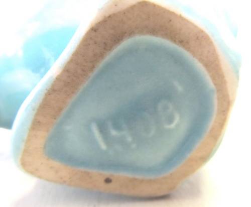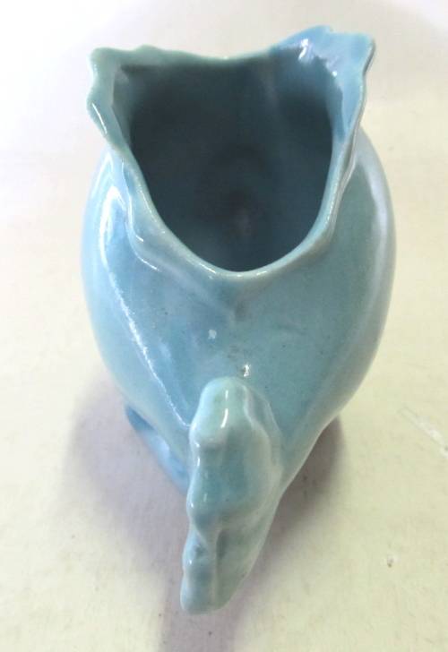 A blue Lucia Ware fish vase, no. 1408 (listed on page 2 of the undated Lucia Ware catalogue). Made by Boksburg East Potteries (1945–late 1950s). Condition good: no chips or cracks. Size: 95 x 80 x 55 mm.