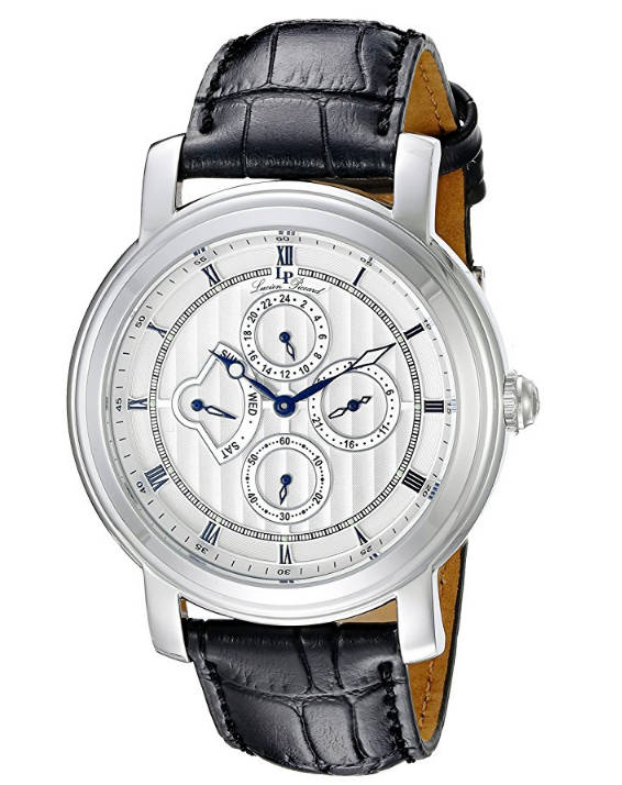 A highly regarded profile in time from the new Lucien Piccard Valarta collection. Classically elegant multi-function men's watch recalls the debonair spirit of the brand's early designs with a vintage inspired dial featuring shaped sword hands and Roman numeral hour markers along with day, date, 60-second and 24-hour subdials. The impressive 45mm diameter case in your choice of highly polished stainless steel, rose or yellow gold-tone stainless steel is presented on an attractive alligator-textured leather strap.