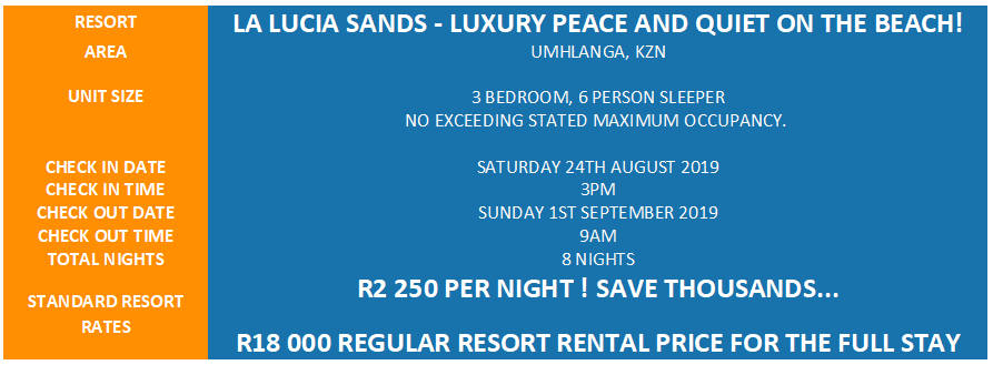As well as fantastic onsite facilities including, swimming pool, sauna, tennis, sun beds and barbecues, La Lucia Sands is a gateway to Durban's glorious beaches, restaurants, shopping, golf and parks.The resort is situated on a non-swimming beach.